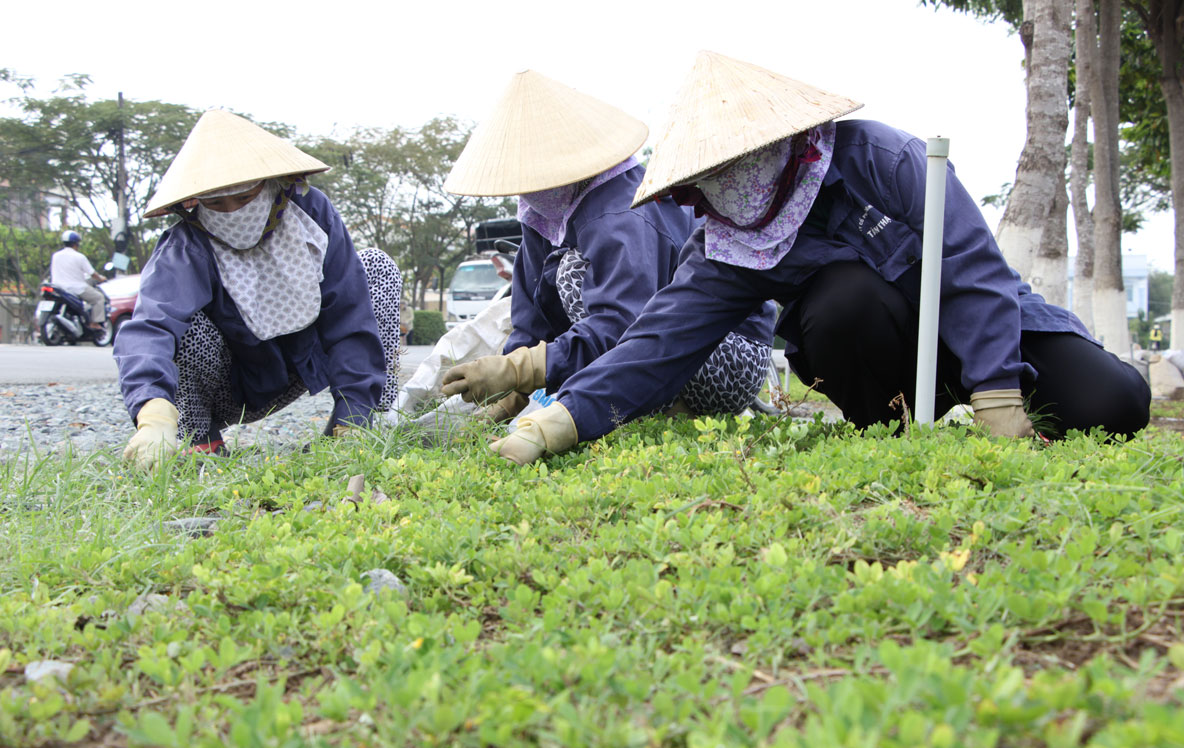 Dưới cái nắng trưa oi ả, những nữ công nhân Công ty Công trình đô thị Tân Thạnh tỉ mỉ nhổ những bụi cỏ lẫn trong thảm hoa đậu. Sau đợt làm cỏ này, các chị sẽ dặm lại các mảng hoa tàn, bón phân chuẩn bị đợt ra hoa vào Tết Nguyên đán sắp tới. Công việc tưởng chừng đơn giản nhưng đòi hỏi sự cần mẫn. Chị Nguyễn Thị Hương, người có 6 năm làm công việc chăm sóc cây cảnh trong nội ô thị trấn Tân Thạnh, vui vẻ: “Đội chúng tôi chịu trách nhiệm chăm sóc mảng xanh cho thị trấn. Công việc nhẹ nhưng chẳng lúc nào ngơi tay. Hết chăm tỉa cây đến vệ sinh đường phố, việc nối việc để giữ cảnh quan luôn sạch, đẹp”.