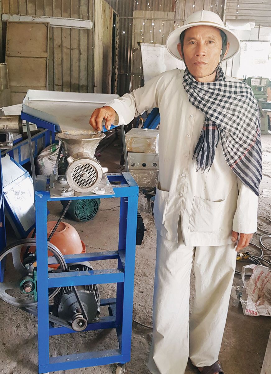 Với mong muốn giúp người dân bớt nhọc nhằn, chăn nuôi hiệu quả, ông Đinh Văn Sơn, ngụ xã Long Sơn, huyện Cần Đước, không ngừng tìm tòi, nghiên cứu, sáng chế các loại máy ép, sấy cám viên để tạo thức ăn từ tôm, cua, cá tạp, ốc bươu vàng, rau củ, bã đậu, bã bia,... phục vụ chăn nuôi heo, gà, vịt,...