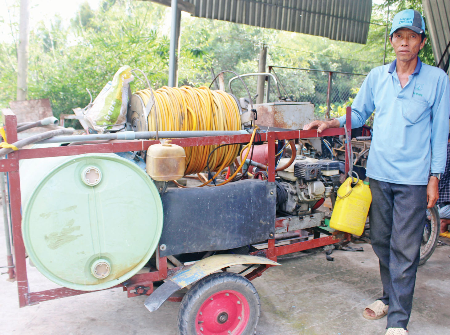 Ông Trần Trọng Đức đang sử dụng máy phun vôi do mình sang chế