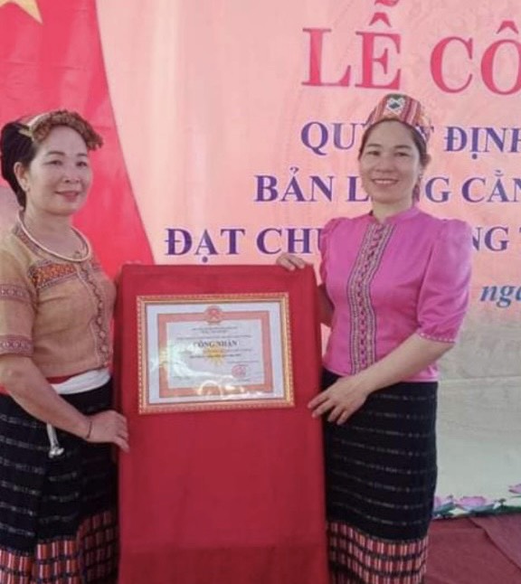 | Chị Lô Thị Nam (người mặc áo hồng) đại diện bản Làng Cằng nhận Chứng nhận bản nông thôn mới năm 2022. |