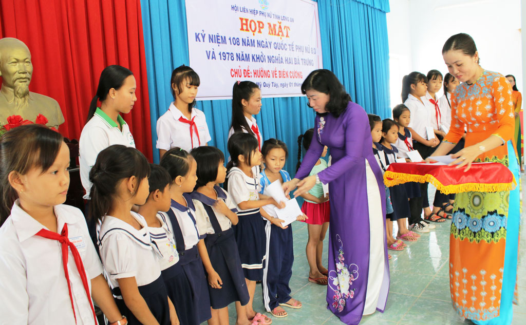 Hội Liên hiệp Phụ nữ Việt Nam tỉnh luôn quan tâm công tác an sinh xã hội. (Trong ảnh: Chủ tịch hội - Nguyễn Hồng Mai tặng học bổng cho học sinh nghèo xã Mỹ Quý Tây, huyện Đức Huệ)