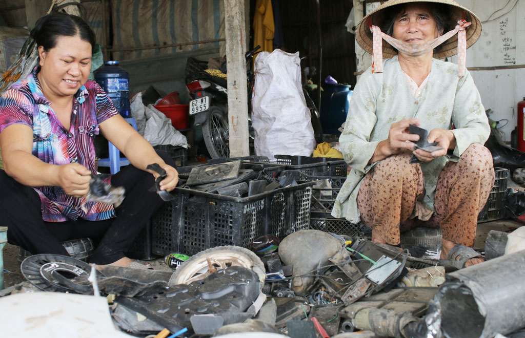 Chúng tôi đến thăm căn nhà cũng là nơi thu mua phế liệu của chị Trần Thị Thu Lan tại ấp Chánh Nhứt, xã Long Phụng, huyện Cần Giuộc, tỉnh Long An. Giữa trưa nắng, chị cặm cụi lựa từng loại phế liệu để kịp giao cho đại lý. “Dạo này, hàng gấp nên tôi tranh thủ làm buổi trưa, chứ ngày thường thì nghỉ” - chị nói.