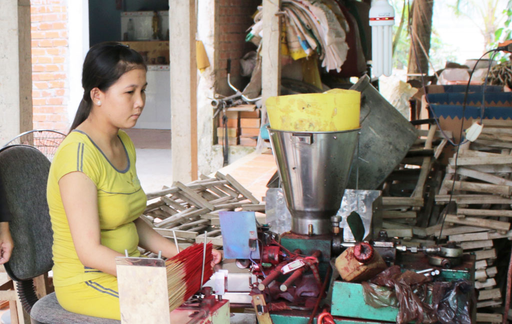 Không chỉ có chị Hiền, chị Nguyễn Thị Bích Tiền cũng được mượn vốn từ chi hội. Cuộc sống tuy không quá khó khăn như chị Hiền nhưng sau khi lập gia đình, chị Tiền phải ở nhà chăm sóc 2 con nhỏ. Để có thêm thu nhập, chị bàn với chồng dành dụm tiền mua máy về xe nhang. Không đủ chi phí, chị được các chị PN tại ấp cho mượn vốn. Nhờ cơ sở xe nhang, chị có thu nhập, phụ chồng nuôi con ăn học.