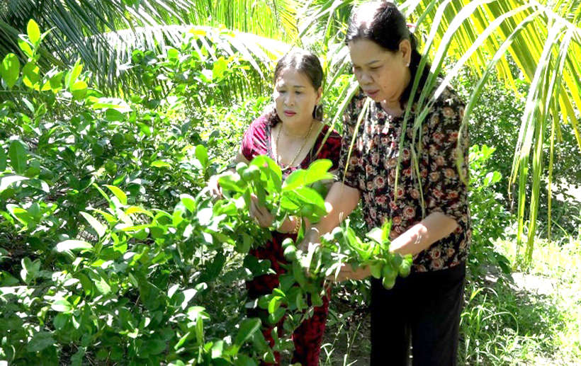 Mô hình trồng dừa xen cây chanh của bà Trần Thị Lan (bên trái).