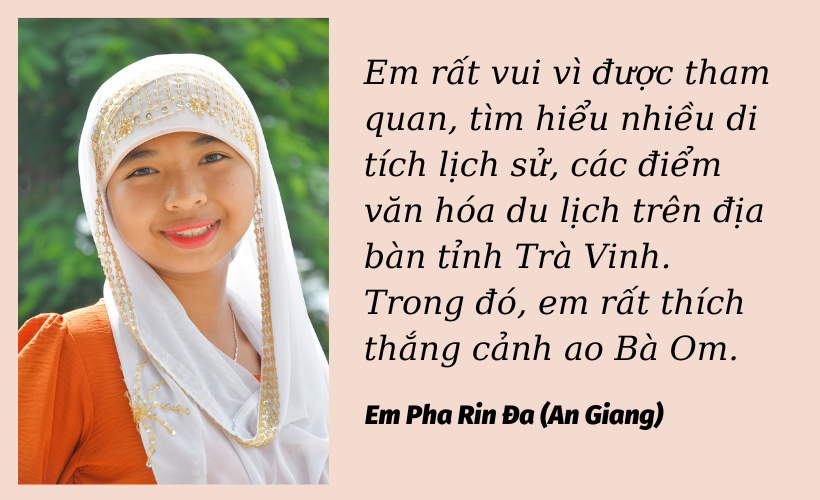 Em Pha Rin Đa (An Giang): Pha Rin Đa là người dân tộc Chăm và có tên dân tộc là Sa La Máh, sinh năm 2009 đến từ huyện An Phú, tỉnh An Giang vừa hoàn thành chương trình học phổ thông lớp 7 với 07 năm liền là học sinh giỏi. Đặc biệt, vào năm 2020, Pha Rin Đa còn vinh dự nhận danh hiệu “Cháu ngoan Bác Hồ” cấp toàn quốc và được tham dự Đại hội Cháu ngoan Bác Hồ tại Thủ đô Hà Nội.