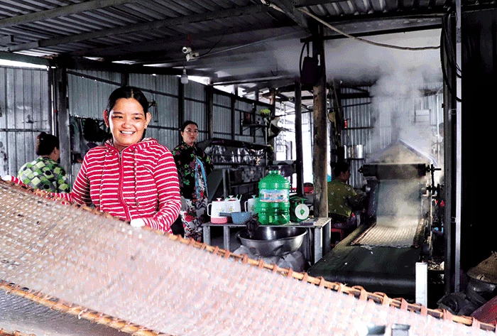 Niềm vui của chị Bích Tuyền khi làng nghề bánh tráng Thuận Hưng vào mùa Tết.