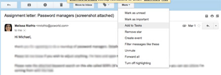 Đã có hàng chục ứng dụng phía thứ ba làm công việc này, nhưng bạn không cần phải nhọc công tìm kiếm xa xôi vì vẫn có thể thực hiện nó ngay trong Gmail nhờ vào Google Tasks. Trước tiên, bạn hãy chọn email muốn làm nội dung công việc, nhấp vào nút "More" / "Add to Tasks" hay nhấn tổ hợp phím Shift + T.