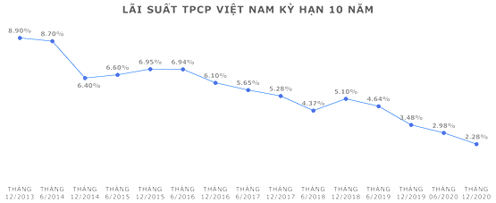 Công bố của Kho bạc Nhà nước cho thấy lãi suất trái phiếu chính phủ đang có xu hướng giảm dần, từ mức 3,48% cuối năm 2019 xuống còn 2,28% cuối năm 2020.