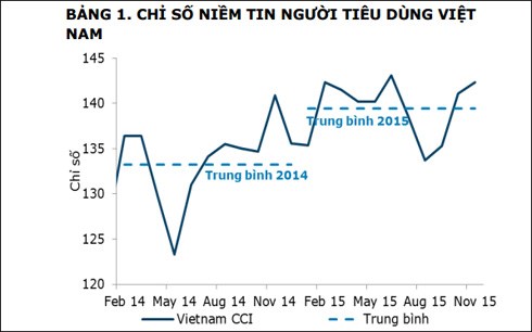 Cụ thể, chỉ số niềm tin người tiêu dùng Việt Nam tăng nhẹ 1,2 điểm, lên mức 142,3 điểm trong tháng 11, trên mức trung bình 133,3 điểm của năm 2014.