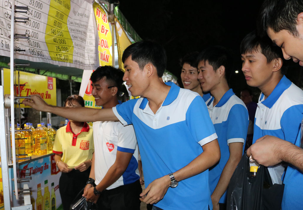 Tại gian hàng của doanh nghiệp sản xuất dầu ăn nhãn hiệu Tường An, lượng hàng cung cấp trong ngày đã hết chỉ sau vài giờ đồng hồ bày bán. Vừa mua được 3 chai dầu ăn loại 2 lít, 1 lít, 350ml và được tặng thêm 1 cái ly thủy tinh với phiếu 100.000 đồng, chị Hồ Thị Kim Chi - CN Cty TNHH Thực phẩm Xanh Long An, hồ hởi khoe, đây là món hàng chị ưng ý nhất, đáp ứng đúng nhu cầu cần thiết cho bữa cơm gia đình trong những ngày tết.