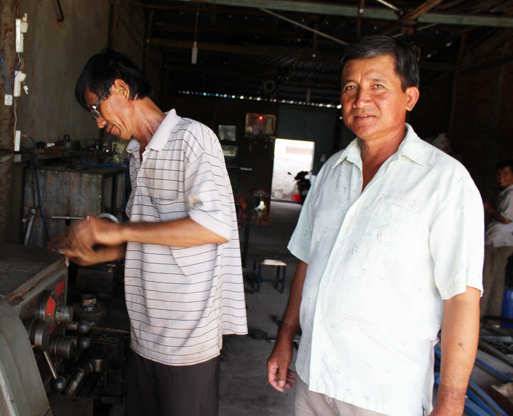 Ông Võ Văn Bân (phải) trong xưởng cơ khí mới mở của gia đình