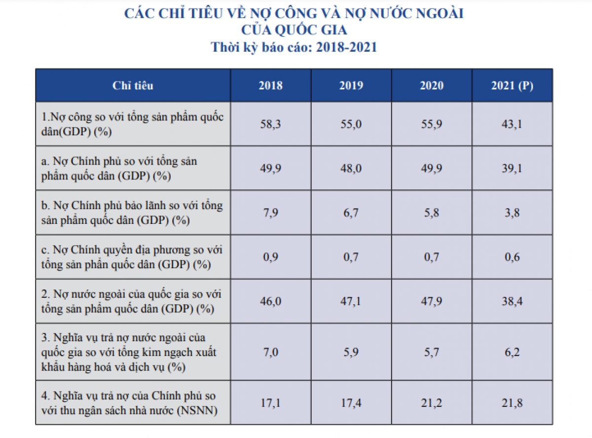 Theo đó, tính đến hết năm 2021, nợ nước ngoài của quốc gia giảm chỉ còn 38,4% GDP so với năm 2018 là 46% GDP. Nghĩa vụ trả nợ nước ngoài của quốc gia so với tổng kim ngạch xuất khẩu năm 2021 là 6,2%. Nghĩa vụ trả nợ của Chính phủ so với thu ngân sách nhà nước năm 2021 khoảng 21,8%, có chiều hướng tăng dần đều theo các năm.