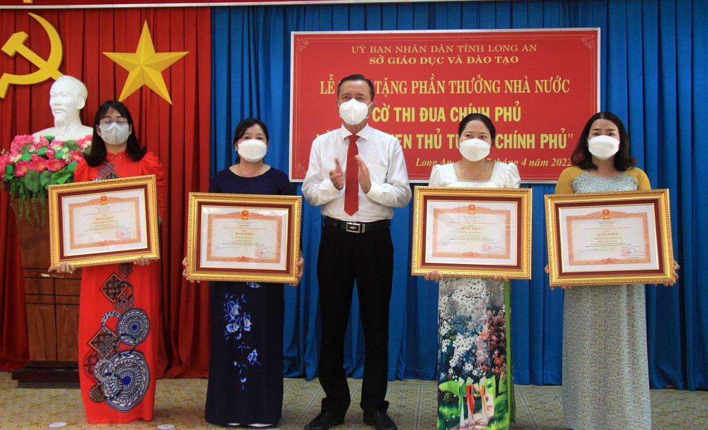 Hiệu trưởng Trường Mầm non Tân Phước Tây - Đồng Thị Ngọc Hiếu (bìa phải) nhận bằng khen của Thủ tướng Chính phủ