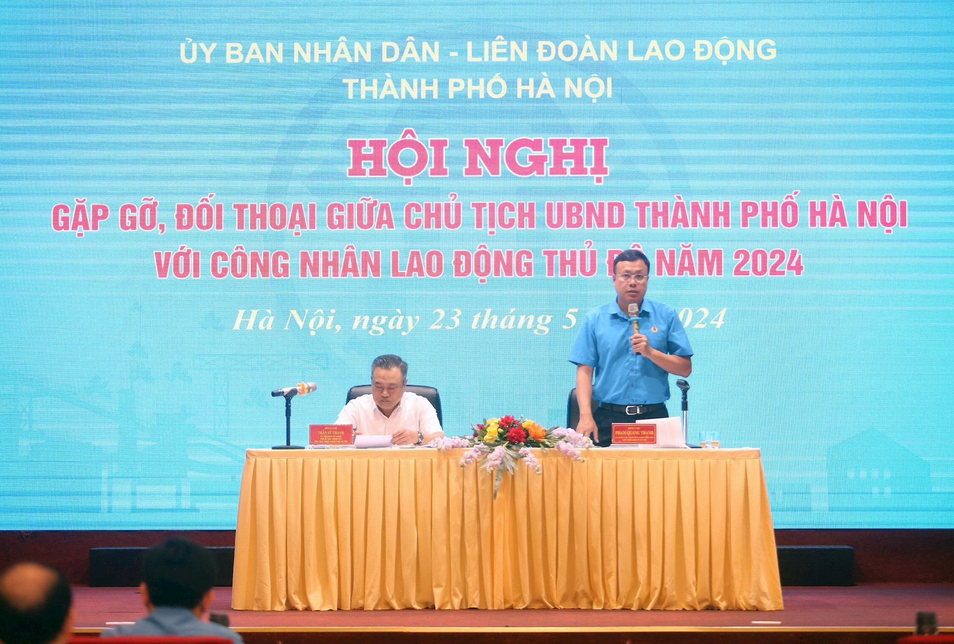 | Chủ tịch UBND TP Hà Nội Trần Sỹ Thanh và Chủ tịch LĐLĐ TP Hà Nội Phạm Quang Thanh chủ trì hội nghị. Ảnh: Viết Thành |