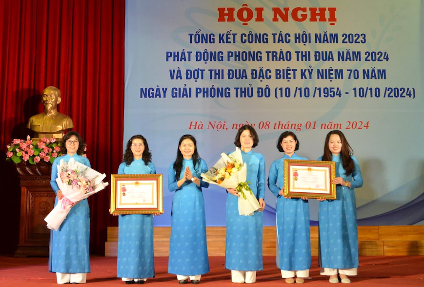 Tại hội nghị, Văn phòng Hội Liên hiệp phụ nữ thành phố Hà Nội đã vinh dự nhận Huân chương Lao động hạng Nhì, Ban Tổ chức Hội Liên hiệp phụ nữ thành phố Hà Nội nhận Huân chương Lao động hạng Ba. 9 tập thể nhận bằng khen của Trung ương Hội Liên hiệp phụ nữ Việt Nam; 17 tập thể nhận bằng khen của UBND thành phố Hà Nội; Hội Liên hiệp phụ nữ thành phố Hà Nội khen thưởng 24 Hội phụ nữ quận, huyện, thị xã, đơn vị trực thuộc; 181 cơ sở Hội và 75 cá nhân có thành tích xuất sắc trong tổ chức thực hiện nhiệm vụ công tác Hội và phong trào thi đua năm 2023./.