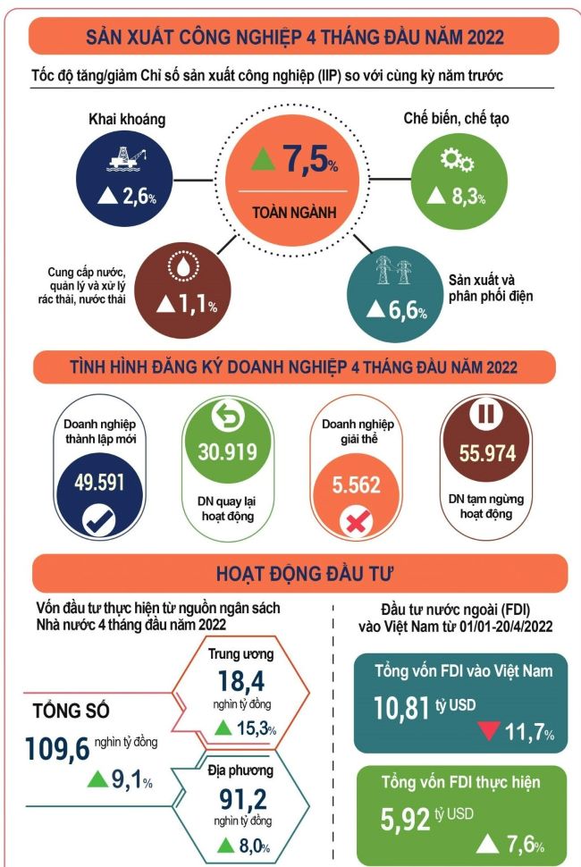 Tính chung 4 tháng đầu năm 2022, chỉ số sản xuất toàn ngành công nghiệp tăng 7,5% so với cùng kỳ 2021.