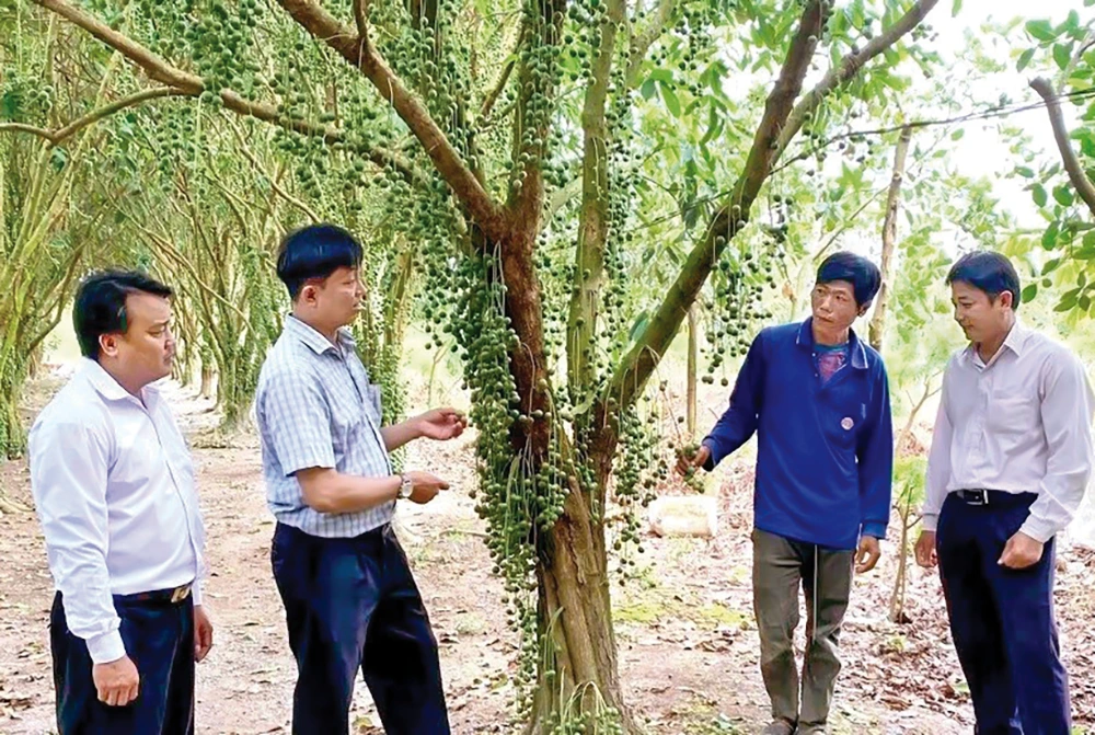 Cán bộ Phòng giao dịch NHCSXH Thốt Nốt thăm hỏi hộ dân vay vốn ưu đãi trồng dâu kết hợp vườn du lịch.