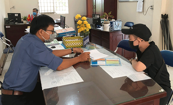 Giáo viên trực tiếp thu nhận hồ sơ, hướng dẫn học sinh làm thủ tục đăng ký học nghề tại trường