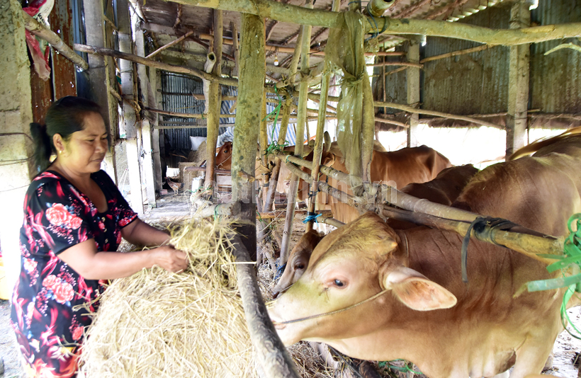 Bà Thạch Thị Sô Phanh, ấp Bổn Thanh, xã Ngũ Lạc chăm sóc đàn bò nuôi.