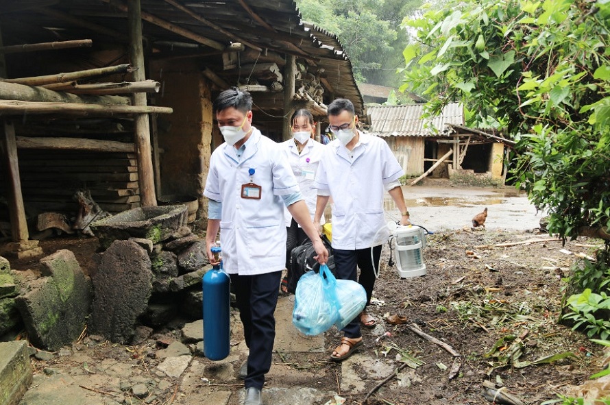 | Lực lượng y tế cơ sở tỉnh Lào Cai vận chuyển trang thiết bị để tiêm vaccine tại nhà cho người dân. (Ảnh: HL). |