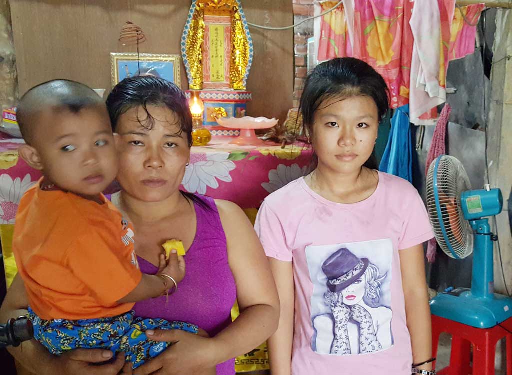 Chị Phạm Thị Liễu và 2 con thơ bên bàn thờ anh Nguyễn Thành Tâm