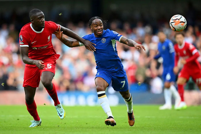 Trung vệ Konate (trái) đeo bám tiền đạo của Chelsea ở trận mở màn EPL. Ảnh: Getty Images