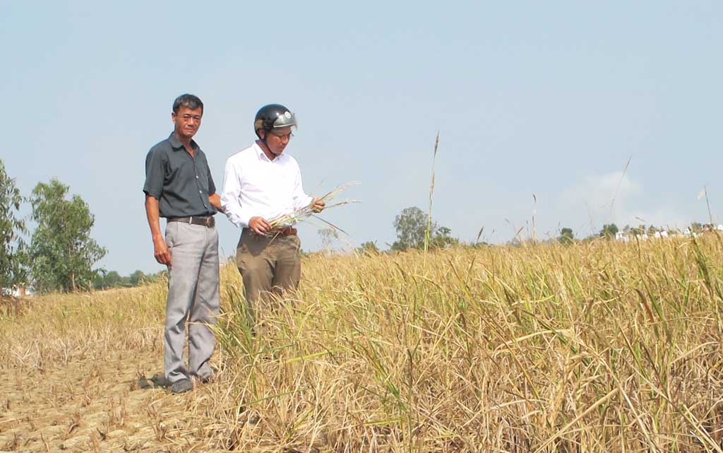 Ông Nguyễn Văn Phe - nông dân ấp Phú Thạnh (áo đen) cùng Chủ tịch UBND xã Long Phụng - Huỳnh Trung Hậu bên thửa ruộng không thu hoạch được vì hạn, mặn