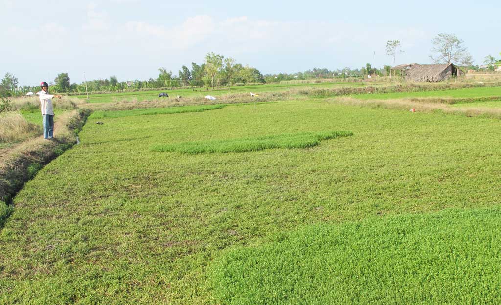 Là một trong những địa phương có diện tích trồng rau màu nhiều và ổn định của huyện, hiện tại, diện tích trồng rau của Mỹ Lộc giảm khoảng 10ha (từ 226ha xuống còn 216ha). Chị Trịnh Thị Bé, ấp Lộc Hậu chia sẻ, gia đình chị mướn 4.000m2 đất ruộng để trồng rau đắng. Loại rau này trồng không khó nhưng đòi hỏi phải có nước thường xuyên. Thời gian sinh trưởng tương đối ngắn, chỉ cần đủ nước và chăm sóc kỹ khoảng hơn 1 tháng là có thể thu hoạch. Vì vậy, gia đình chị thường trồng quanh năm. Mỗi vụ, gia đình thu được vài triệu đồng. Khoảng 3 tháng trở lại đây, thiếu nước ngọt nên gia đình tự bỏ tiền mua ống dẫn nước, chi phí phát sinh thêm nhưng sản lượng không cao như những vụ trước.
