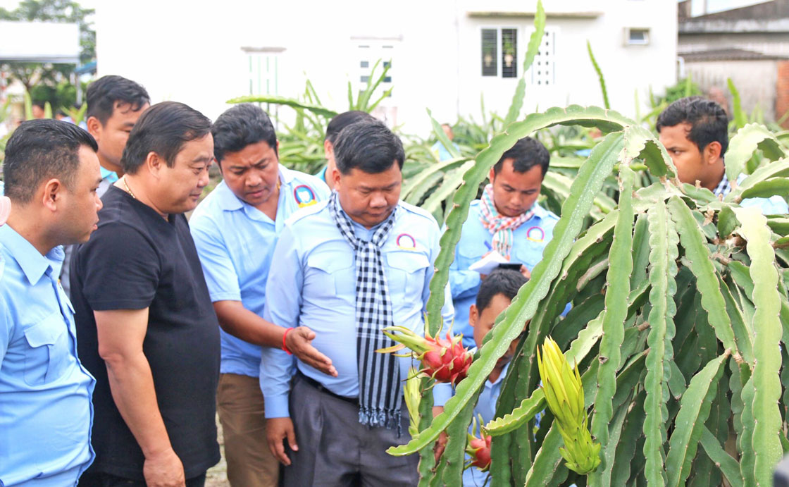 Ông Nguyễn Quốc Trịnh (áo đen) giới thiệu về quy trình sản xuất thanh long sạch với thanh niên tỉnh Svay Rieng, Campuchia