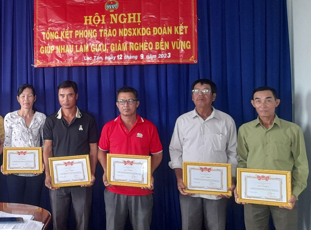 Anh Trần Minh Hoàng (giữa) nhận giấy khen của Chủ tịch UBND xã Lạc Tấn