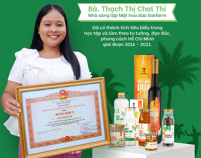 | Chị Thạch Thị Chal Thi, nhà sáng lập Mật hoa dừa Sokfarm vinh dự được Thủ tướng Chính phủ tặng Bằng khen vì có thành tích tiêu biểu trong học tập và làm theo tư tưởng, đạo đức, phong cách Hồ Chí Minh giai đoạn 2016 - 2021 (Ảnh: NVCC) |