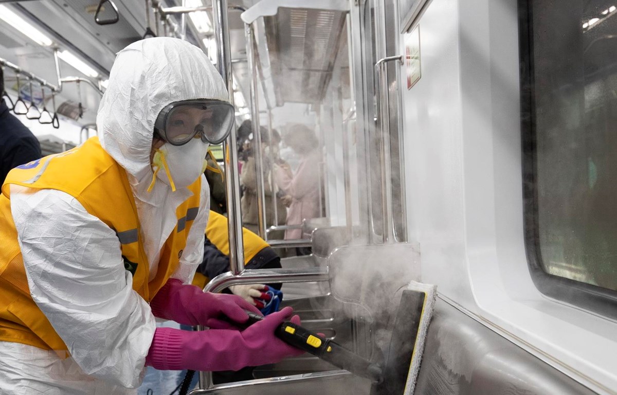 Nhân viên khử trùng tàu điện ngầm tại Seoul, Hàn Quốc, nhằm ngăn chặn sự lây lan của COVID-19 ngày 11/3. (Ảnh: THX/TTXVN)