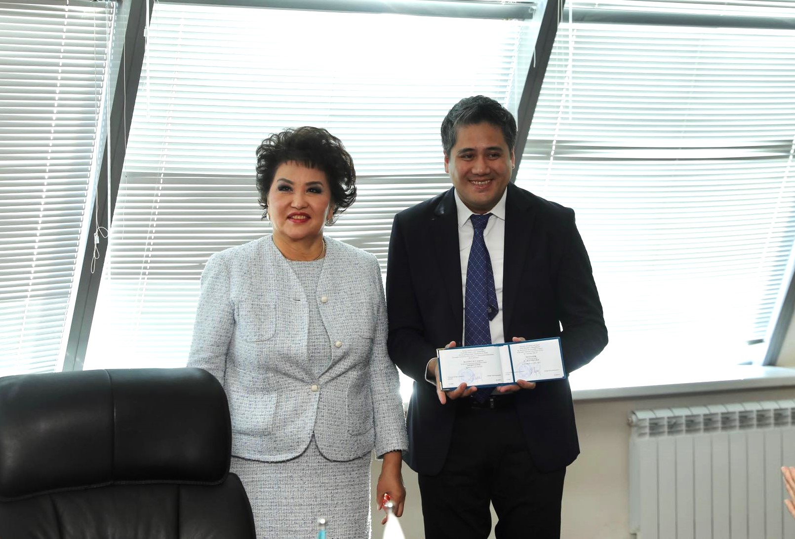 | Giám đốc Trường ĐH Quốc gia Nghệ thuật Kazakhstan GS. NSND Aiman Musakhajaeva trao học hàm Giáo sư danh dự cho NSƯT Bùi Công Duy. Ảnh: KazNUA |