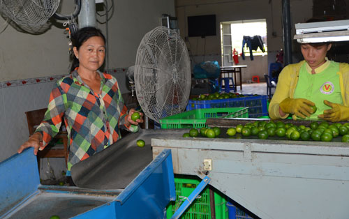Bà Nguyễn Thị Ba (bên trái) bên dây chuyền sơ chế chanh không hạt