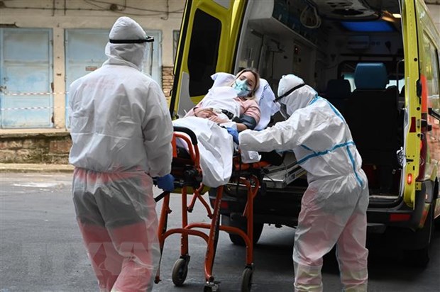Chuyển bệnh nhân mắc COVID-19 từ xe cứu thương vào một bệnh viện ở Budapest, Hungary. (Ảnh: AFP/TTXVN)