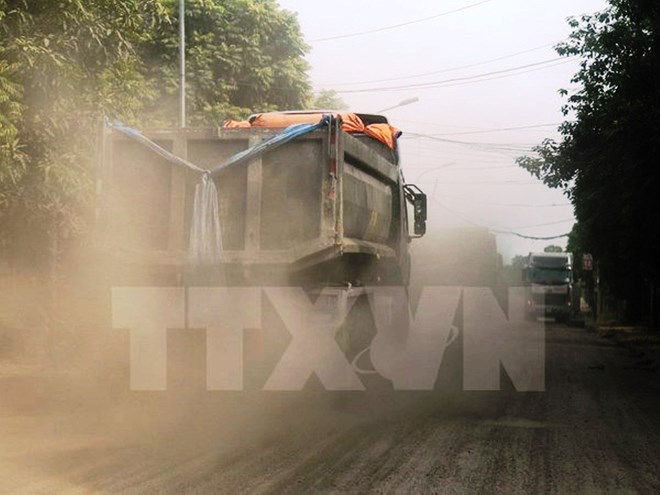 Xe tải lưu thông gây bụi mù mịt tại Phú Thọ. (Ảnh: Trung Kiên/TTXVN)
