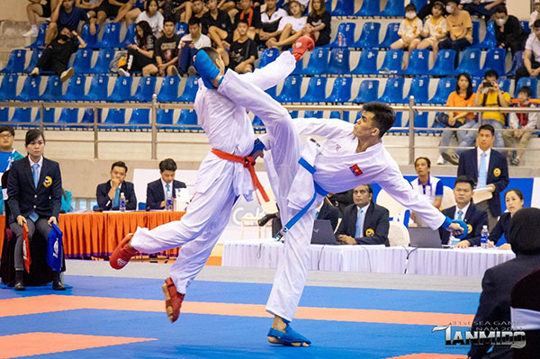 Võ sĩ Ðỗ Thanh Nhân (phải) đoạt HCV SEA Games 31, là niềm kỳ vọng của Karate Cần Thơ tại Ðại hội Thể thao toàn quốc lần thứ IX-2022. Ảnh: CTV
