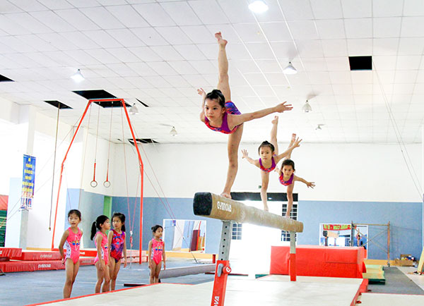 Các VĐV năng khiếu Cần Thơ tập động tác giữ thăng bằng trên xà.