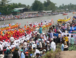 Đua ghe Ngo là môn thể thao rất hấp dẫn và rất hào hứng. Trưa ngày rằm, khi nước bắt đầu dâng lên, người ta đứng chật kín hai bên bờ sông, tràn xuống mép nước, ghe xuồng thì đậu suốt hơn một cây số. Tiếng trống, tiếng dàn nhạc ngũ âm, tiếng còi nổi lên rộn rã. Sau hồi còi hiệu lệnh xuất phát, từng cặp ghe đua với trăm đôi tay chèo lực lưỡng cuồn cuộn cơ bắp căng vồng cúi rạp người vung chèo đều tăm tắp theo nhịp còi và tiếng phèng la thúc giục hướng chiếc ghe Ngo vút nhanh về đích. Tiếng trống, tiếng loa hòa trong tiếng reo hò, vỗ tay cổ vũ, thúc giục náo động cả mặt sông.