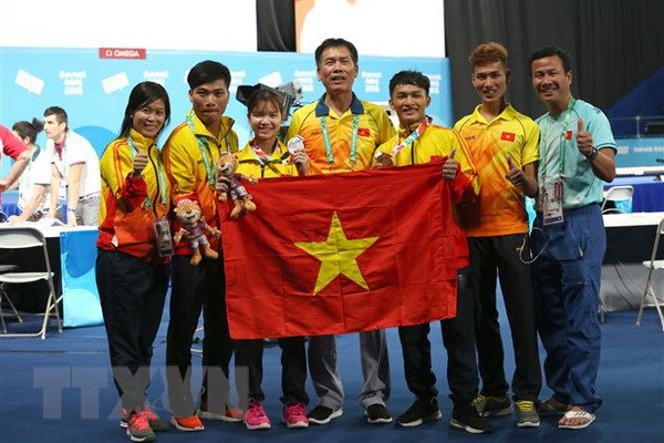 Đoàn Việt Nam chia vui với các vận động viên cử tạ đoạt huy chương vàng và huy chương bạc trong ngày thi đấu đầu tiên. (Ảnh: Hoài Nam/TTXVN)