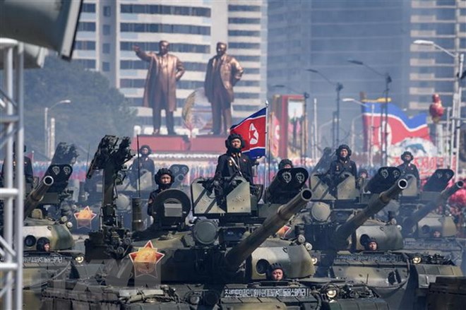 Các binh sỹ, pháo binh và xe tăng đã diễu binh trước sự chứng kiến của nhà lãnh đạo Triều Tiên Kim Jong-un tại trung tâm thủ đô Bình Nhưỡng, song tên lửa lớn nhất được trình diễn lần này lại là tên lửa trận địa tầm ngắn.