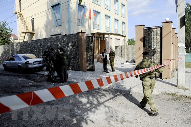 Nhân viên an ninh điều tra tại hiện trường một vụ nổ ở Donetsk, miền Đông Ukraine. (Ảnh: AFP/TTXVN)