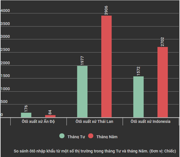 Với thị trường Indonesia, trong tháng Năm, đã có 2.702 xe từ nước này xuất vào Việt Nam với tổng trị giá hơn hơn 48 triệu USD (tháng Tư là 1.572 chiếc). Sau 5 tháng, xe xuất xứ Indonesia nhập về Việt Nam tổng cộng là 8.682 chiếc với trị giá 150 triệu USD.