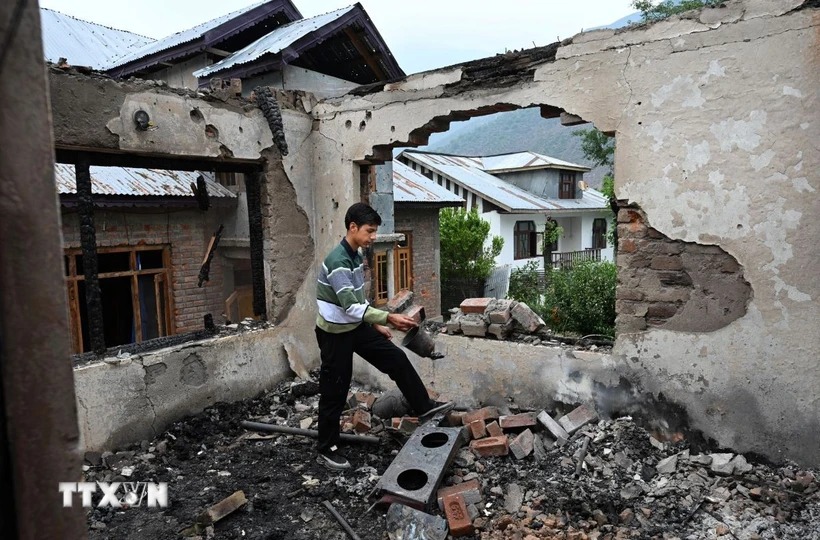 Ngôi nhà bị phá hủy trong cuộc giao tranh giữa quân đội Ấn Độ và Pakistan tại Salamabad, gần Đường kiểm soát (LoC) (Ảnh: THX/TTXVN)
