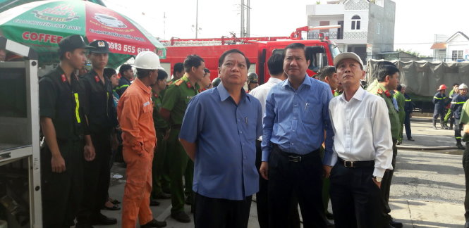 Ông Trần Quốc Trung, Bí thư thành ủy Cần Thơ (trái), thị sát việc tiếp cận hiện trường bên trong của lực lượng công an - Ảnh Lê Dân