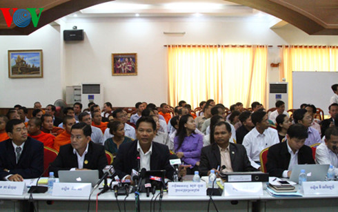 Tiến sỹ Sok Touch (ngồi giữa hàng trên cùng) phát biểu tại cuộc họp báo