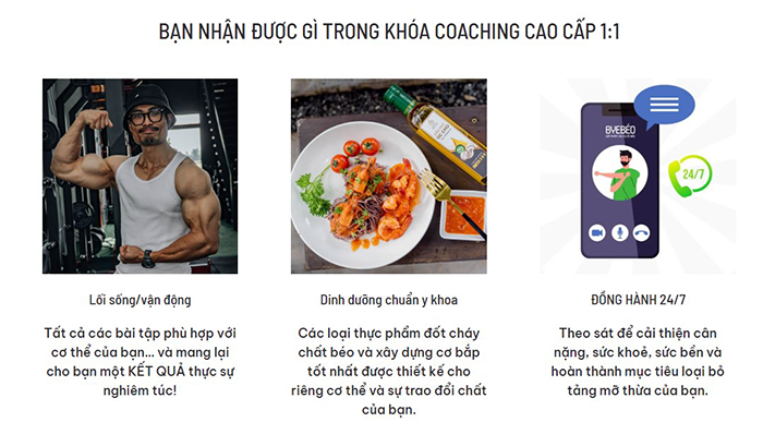 Hệ thống giáo dục và đào tạo cũng là điểm mạnh của Bye Béo. Từ các khóa học giảm béo y khoa, lập kế hoạch dinh dưỡng, đến tập luyện tại nhà cho cả nam và nữ, tất cả đều được thiết kế khoa học và bài bản. Dịch vụ coaching 1:1 cho phép người dùng nhận tư vấn cá nhân hóa, tối ưu hóa kết quả dựa trên nhu cầu và thể trạng riêng.
