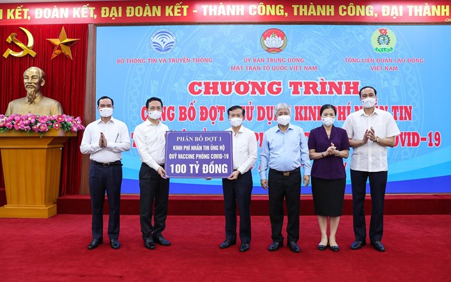 Chiều 13/7, tại Hà Nội, Uỷ ban Trung ương MTTQ Việt Nam phối hợp với Bộ Thông tin và Truyền thông, Tổng Liên đoàn Lao động Việt Nam tổ chức trao số tiền phân bổ đợt 1 là 100 tỷ đồng tới Quỹ vaccine phòng COVID-19. Đây là số tiền tiếp nhận được sau 40 ngày phát động đợt nhắn tin ủng hộ phòng, chống dịch COVID-19 trên Cổng Thông tin điện tử nhân đạo Quốc gia qua đầu số 1408.
