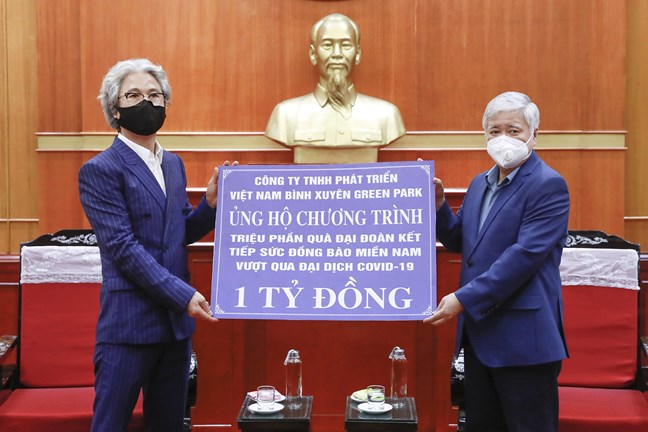 Chiều 27/8, Bí thư Trung ương Đảng, Chủ tịch Ủy ban Trung ương MTTQ Việt Nam Đỗ Văn Chiến đã tiếp nhận ủng hộ 1 tỷ đồng từ Công ty TNHH phát triển Nam Bình Xuyên Green Park ủng hộ Chương trình “Triệu phần quà Đại đoàn kết tiếp sức đồng bào miền Nam vượt qua đại dịch COVID-19”.