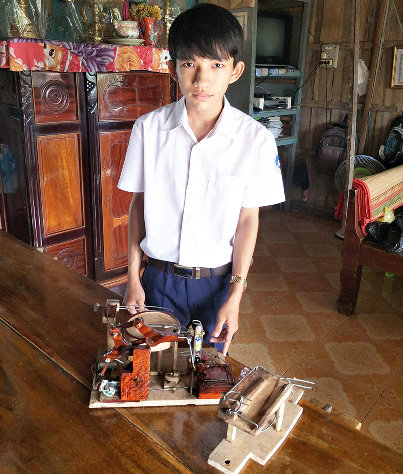 Từ trung tâm xã Thạnh Phú đến nhà Phan Tấn Vinh trên con đường đal với hai bên là đồng lúa xanh bạt ngàn, tôi được nghe về Vinh từ thầy cô, bạn bè và bà con xung quanh. Vinh sinh ra trong gia đình thuần nông, vừa học vừa phụ giúp cha mẹ việc nhà và việc đồng áng, nhưng em luôn nỗ lực phấn đấu vượt qua khó khăn để vươn lên học giỏi. Trong 10 năm học qua, Vinh luôn đạt danh hiệu học sinh giỏi. Ngay từ khi còn nhỏ, Vinh đã thích nghiên cứu, tìm tòi, chế tạo những món đồ chơi đơn giản. Sau này, được học các môn Vật lý, Công nghệ… hiểu được nguyên lý vận hành của những loại máy móc, Vinh càng yêu thích sáng chế.